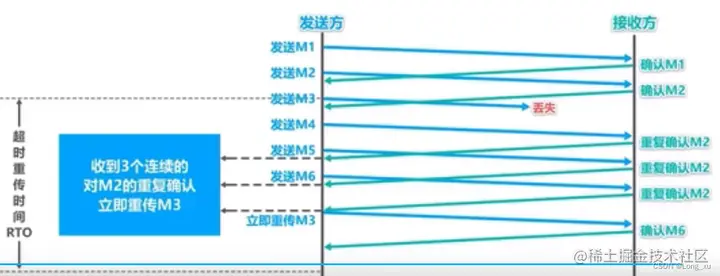 发送方接收到3个重复确认,就知道只丢失了个别报文段,于是不启动慢启动算法,而是执行快恢复算法。