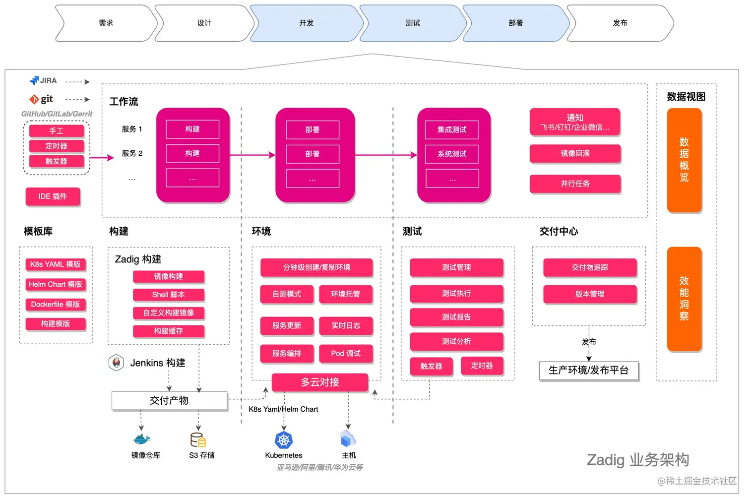 灵活易用的高并发工作流、面向开发者的云原生环境、高效协同的测试管理、强大免运维的模板库、客观精确的效能洞察以及云原生IDE插件等重要特性,为工程师提供统一的协作平面。