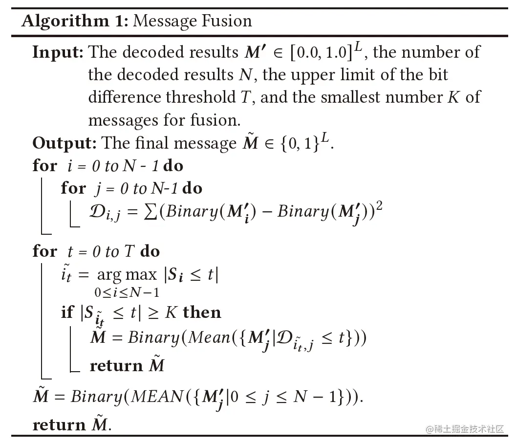 矫正后的水印图像块输入解码器可得到每个块的水印解码结果,但单个块的解码结果存在出错的可能。为提高容错能力,鉴于单张图像上的所有水印图像块嵌着相同水印,本论文引入了基于相似度的消息融合算法来确定最终的水印结果,使得在最坏情况下,如所有块的解码结果都出错,也能得出正确的水印,算法示意图如下。