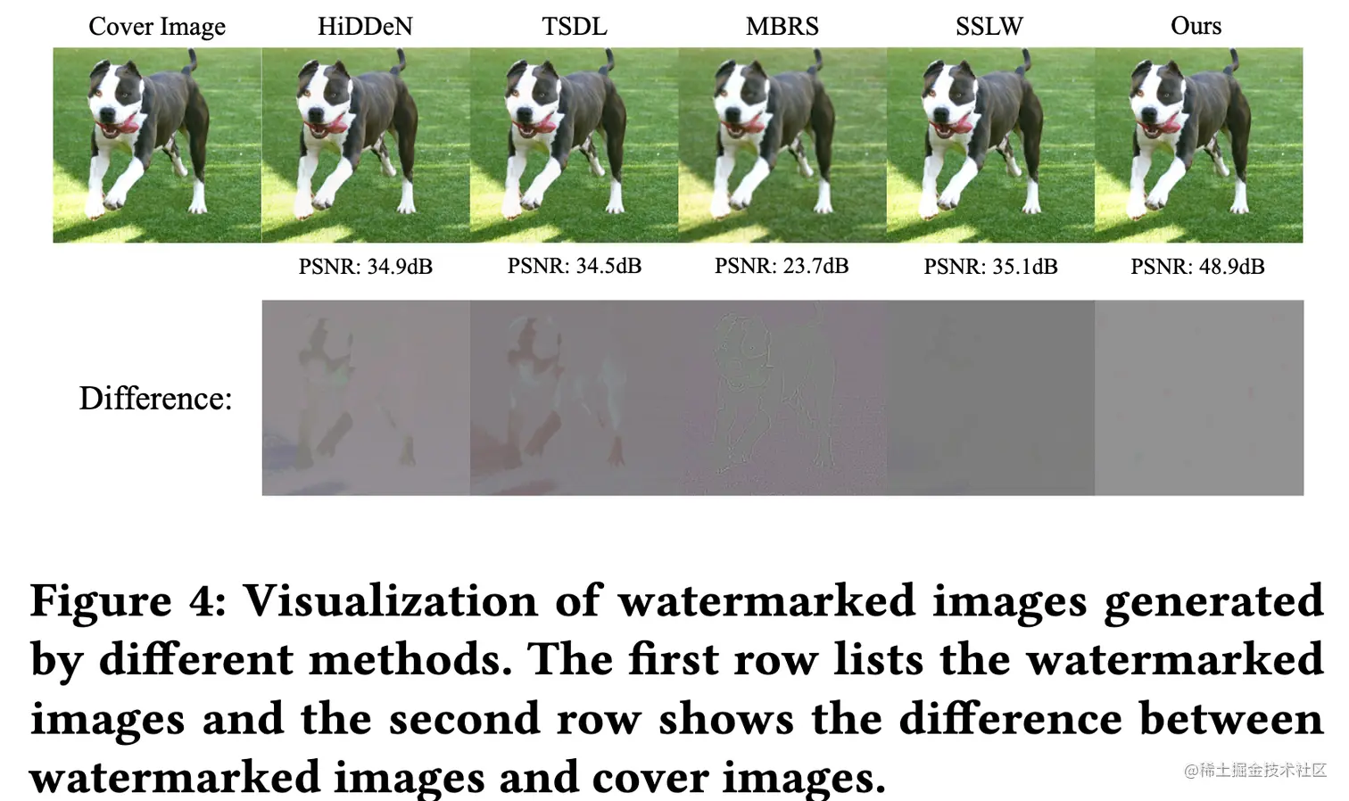 - 图像视觉质量更好:通常水印如果添加地过于明显会影响用户体验,而本方案提出的稀疏水印块修改的图片区域更少(<=20%面积),对用户体验的影响更小。