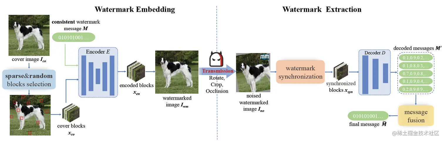 为了解决现有深度图像水印技术在实际应用场景中的诸多弊端,论文提出了一套原创的深度图像水印方案,由离散嵌入、水印同步、消息融合三个核心模块有机组合而成。方案框架图如上所示,给定一张载体图像,该框架在嵌入时随机选取多个图像块并利用编码器模型嵌入水印;在提取阶段,为应对水印图像可能经过多种攻击叠加的复杂情况,该框架引入了一个精细分割模型来定位水印图像块的位置,并矫正图像经过的几何变换,再用解码器从水印图像块中提取水印,最后综合所有提取结果确定最终水印信息。三个核心模块的详细介绍如下。