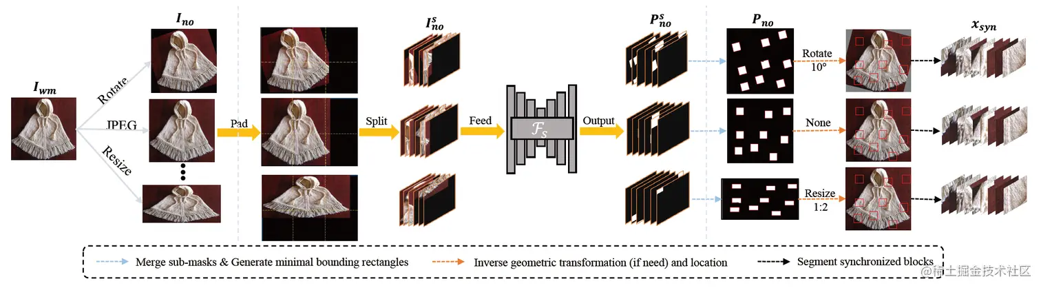 在水印同步模块中,本论文引入了一个轻量级分割模型用于定位水印嵌入的区域,并且采用了Pad&Split的训练-推理策略来提高定位的泛化性和效率(对任意分辨率图片)。在训练时,采用固定分辨率的图片;而在推理时,通过填充(Pad)使其可以分块(Split)成多个与训练集尺寸相同的子图片,便于并行处理以及缩小与训练数据集的差异。即使图像受到几何攻击而变形,相应的预测掩码 也将保持相同的变形,从而在多种未知的几何攻击下也能矫正图片,实现水印同步的目标。