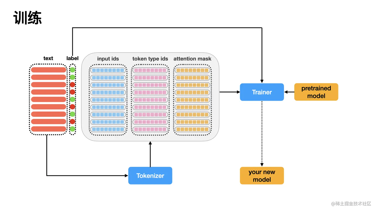 Tokenizer会将数据中的text转换成三个矩阵(或者叫三个Tensor),分别叫input_ids,token_type_ids,attention_mask,至于怎么转换的,我们先不做详细介绍(本仓库后续会介绍)。pretrained model在被加载之前,需要设置一大堆模型的参数,至于要设置什么参数,我们也不做详细介绍。Trainer就是一个训练器,也需要预先设置好一大堆参数。至于要设置什么参数,我们也不做详细介绍。Trainer会把input_ids,token_type_ids,attention_mask;还有数据自带的标签label;还有pretrained model都加载进来,进行训练;- 当所有batch的数据更新完之后,最终就会生成一个模型。