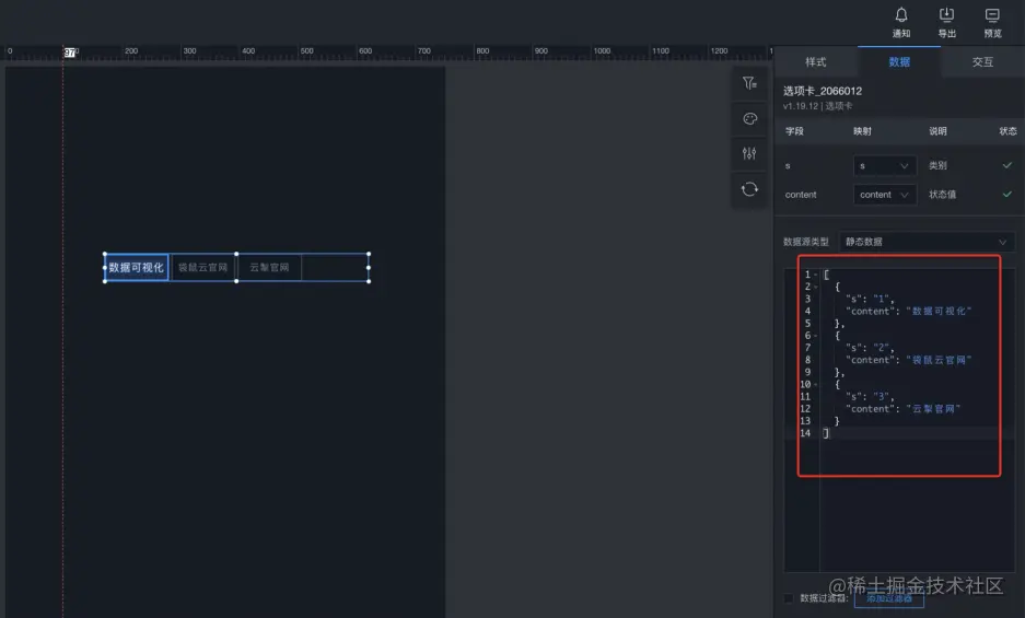 选择使用选项卡组件(可与大屏页面保持一致,或单独创建样式均可);此处选择与大屏一致,数据及样式复用即可。如下图: