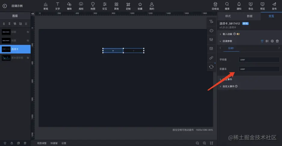 回调参数即为全局性的参数变量,用于控制组件之间参数的传递,可通过设置回调参数来实现数据驱动交互。其中,字段值即参数变量,变量名即对字段值的重命名。