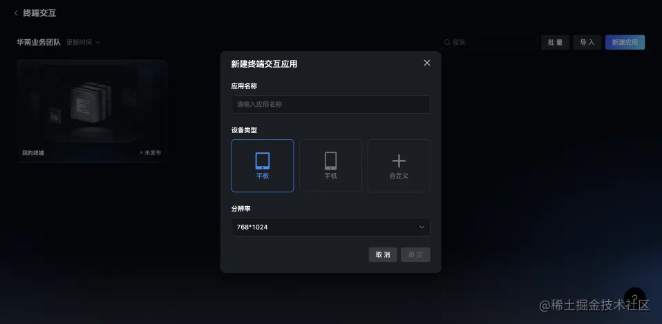 进入 EasyV平台 「终端交互」模块,创建移动操控端项目。在创建过程中可选择系统默认给出分辨率或根据自身移动设备分辨率进行自定义。此处以手机端操控页面为例,如下图: