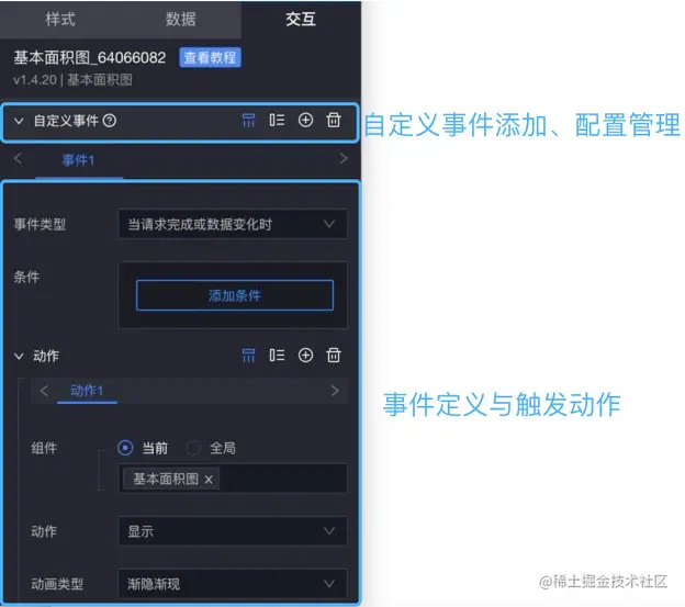 可以由用户选择需要触发的事件、定义触发的条件以及触发后的结果对哪些组件产生影响(如显隐切换、缩放、动态修改配置)。