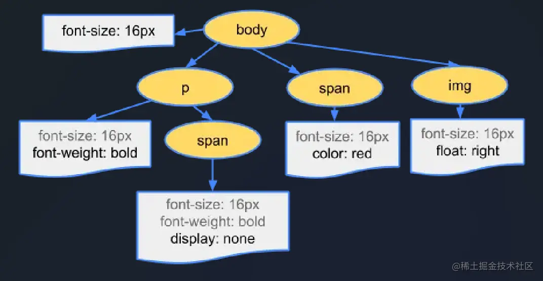 处理CSS,构建CSSOM树。与DOM树类似,浏览器遍历CSS规则,创建CSSOM节点树。任何一个元素的最终样式,都是从浏览器的默认样式和通用规则开始,到这个节点的最上层元素,一层一层合并具体规则,得出最终样式(就是级联)。