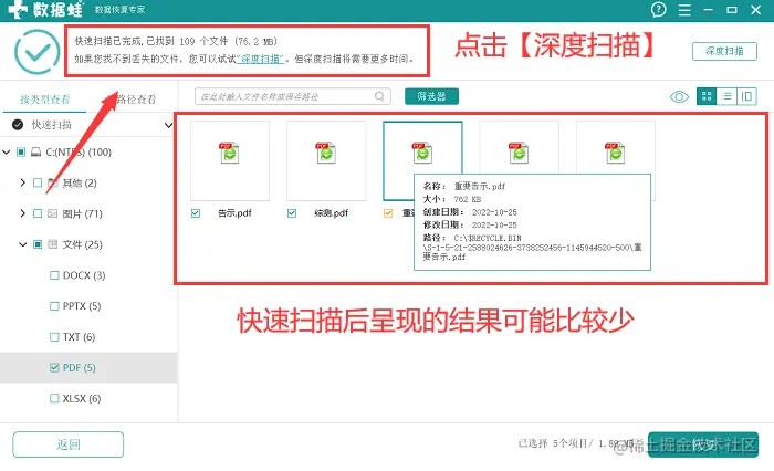 步骤2:第一次扫描是快速扫描,会为用户呈现比较基础的扫描结果,完成后可以对文件进行选择,如果想获得更全面的结果,建议点击 【深度扫描】, 等待所有结果呈现后,再进行操作;