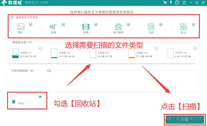 步骤1:点击 【免费试用】进入软件,勾选上 【回收站】 后点击需要扫描的文件类型,完成后点击 【扫描】 ;: