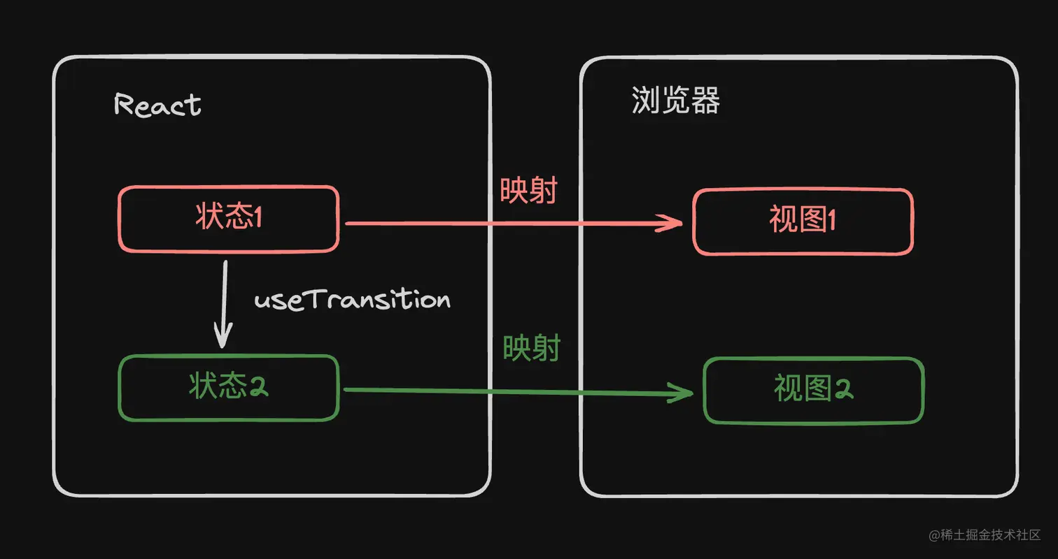 而在React中,使用useTransition后,与其说完成的是视图切换,不如说完成的是:
