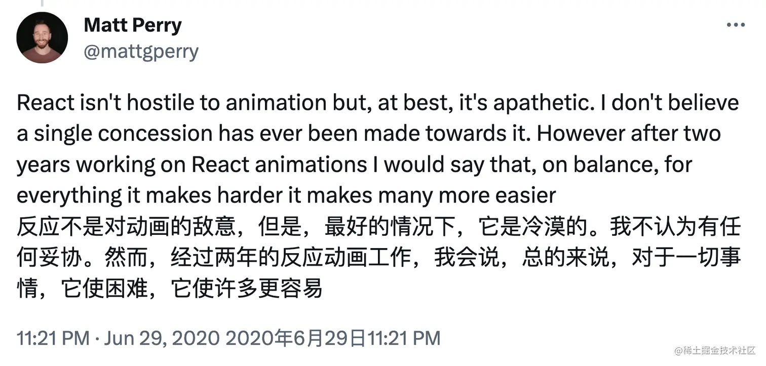 动效库Framer的作者认为,由于开发者很难控制并发更新的完整生命周期,所以很难在并发更新时表达animation效果: