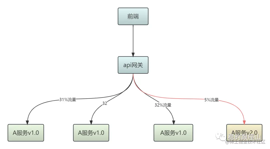 通常情况下我们服务发布按照滚动发布或者分批发布方式进行发布上线,这样的方式发布服务上线了就会等比承载流量,以下图为例A服务有4个节点,按照负载均衡的逻辑每个节点承载25%的流量。当其中一个节点开始发布切换到v2版本过程中有25%的流量会分摊到其他三个节点,v2版本成功发布后单节点会立马承载25%流量。这是我们最常使用的发布方式。