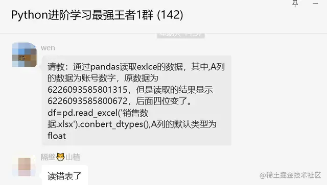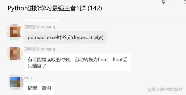 这确实非常诡异,一般来说不会有这个问题,这里【隔壁山楂】提醒是读错表了,后来【郑煜哲·Xiaopang】提示,pd.read_excel中约定dtype=str试试,有可能是读取的时候,自动转换为float,float丢失精度了。