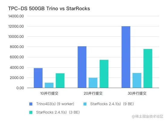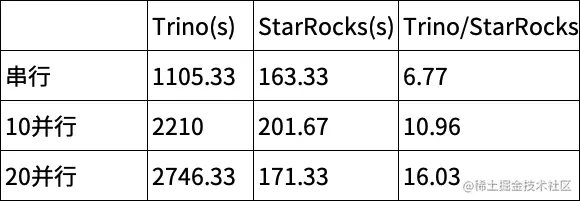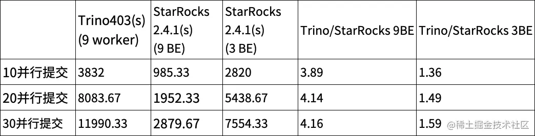 - 测试方式:机器配置相同的情况下完整测试三次,取三次的平均延时。分别测试 10、20、30 并行提交的场景。测试过程中 Trino 和 StarRocks 查询的均为 Hive 上的同一份数据,均未开启本地缓存。