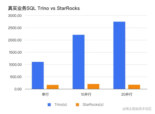 - 总体而言,StarRocks 的查询性能整体优于 Trino。在串行测试中,StarRocks 的性能是 Trino 的 6.77 倍,在 10 并行测试中是 Trino 的 10.96 倍,在 20 并行测试中是 Trino 的 16.03 倍。