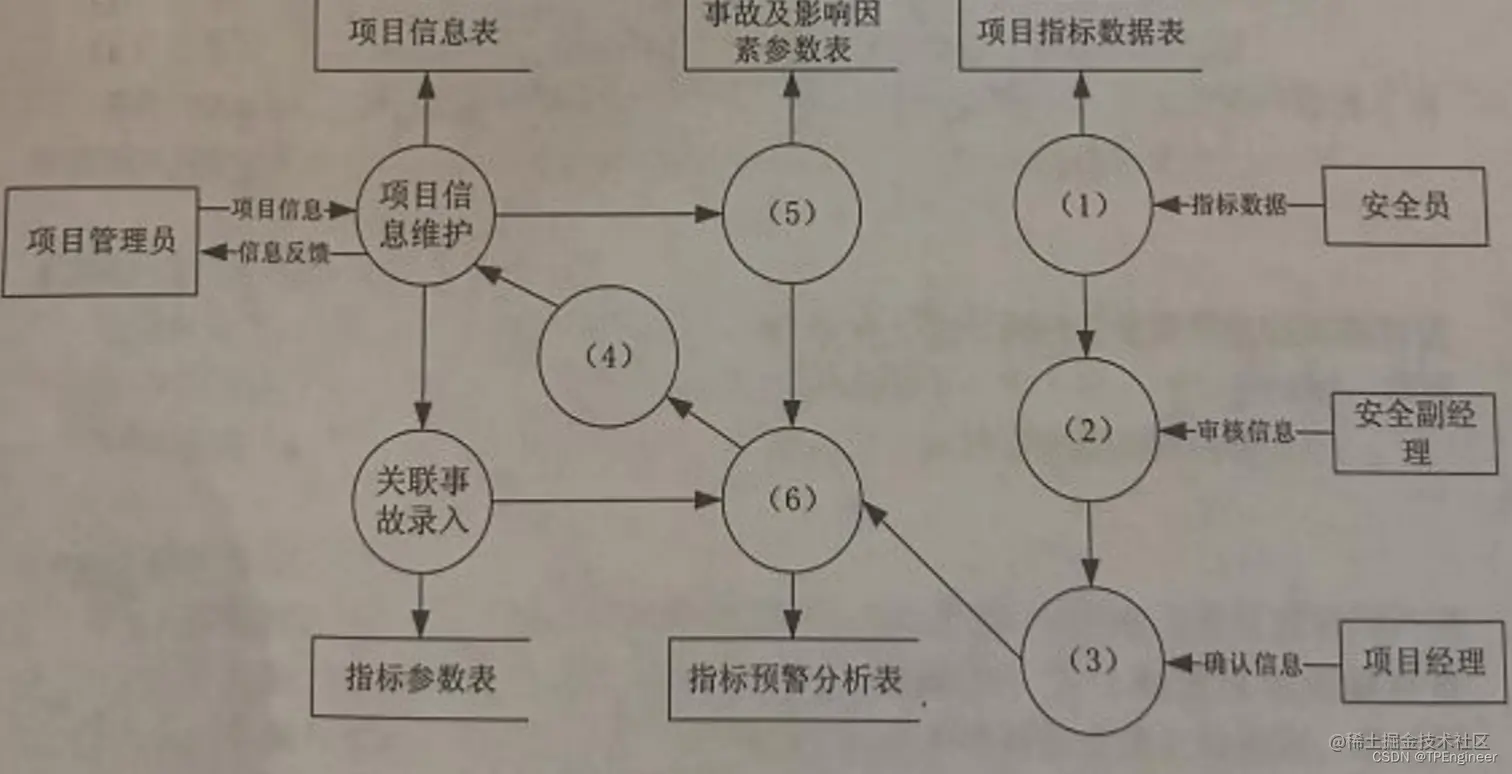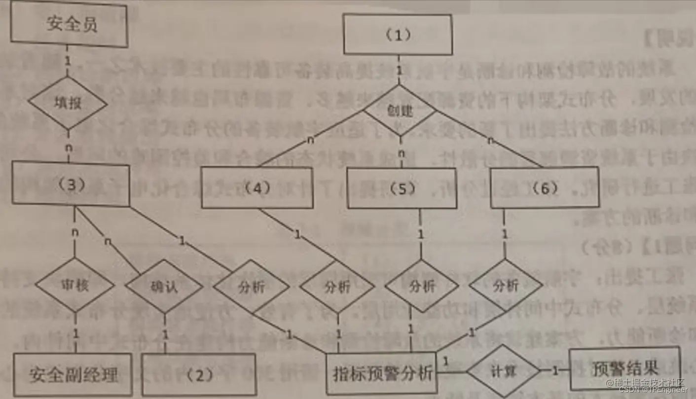 请根据问题1中数据流图表示的相关信息,补充完煤矿建设项目安全预警系统总体E-R图(见图2-2)中实体(1)~(6)的具体内容,将正确答案填在答题纸上。