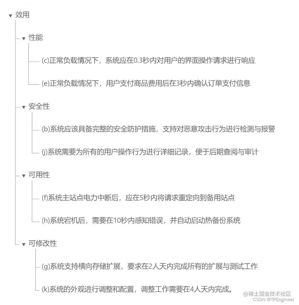 第一个问题考察质量属性效用树。说白了就是从四个维度去整理(a)~(k)3个需求,8个质量属性。