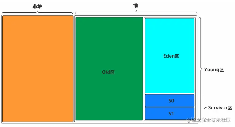 堆分为old区和young区,young区又分为Eden区和Suvior区(s0 + s1)。