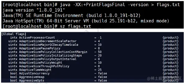 java -XX:+PrintFlagsFinal -version > flags.txt