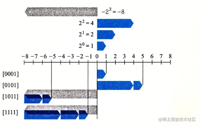 w w w =4 的补码示例,把位 3 作为符号位,因此当它为 1 时,对数值的影响是 − 2 3 = − 8 -2^{3}=-8 − 2 3 = − 8 。(这个权重在图中用带向左箭头的条表示):