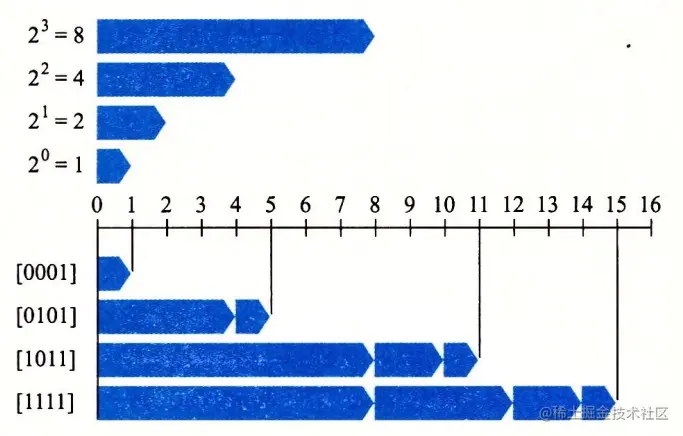 w w w =4 的无符号数示例,当二进制表示中位 i i i 为 1,数值就会相应加上 2 i 2^{i} 2 i :