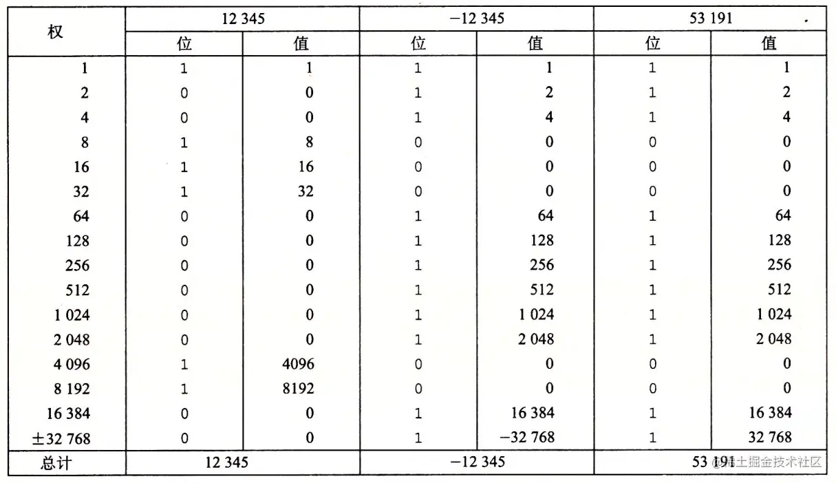 12 345 和 -12 345 的补码表示,以及 53 191 的无符号表示。注意后面两个数有相同的位 表示。