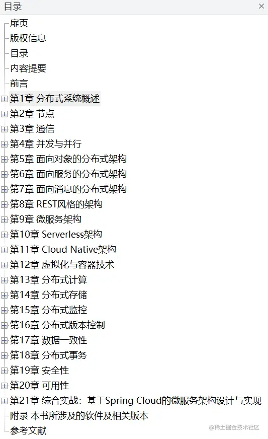 内容包括节点、通信、并发与并行、面向对象的分布式架构、面向服务的分布式架构、面向消息的分布式架构、REST风格的架构、微服务架构、Serverless架构、Cloud Native架构、虚拟化与容器技术、分布式计算、分布式存储、分布式监控、分布式版本控制、数据一致性、分布式事务、安全性、可用性等。