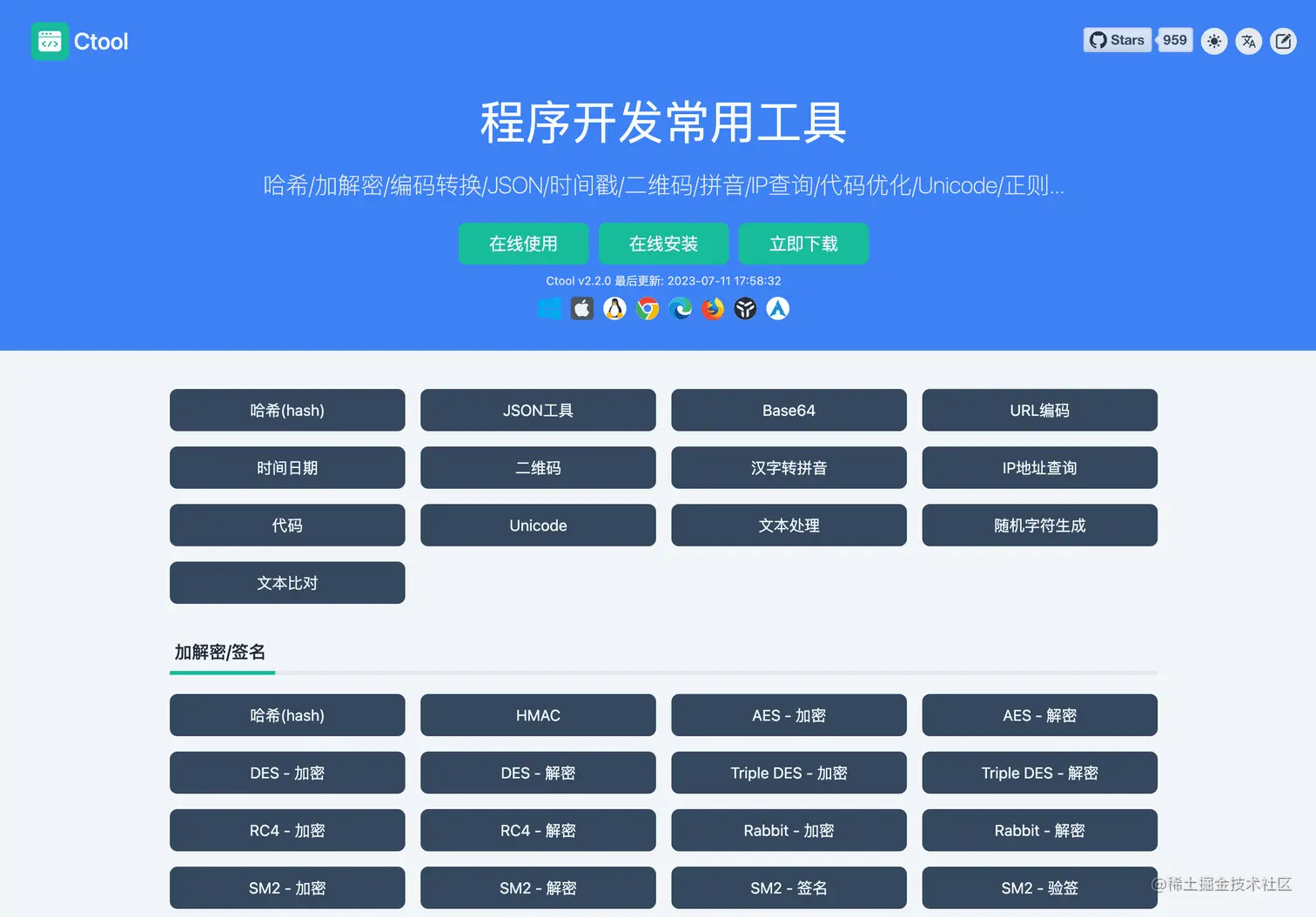 Ctool是一个程序开发常用工具,支持多种平台和浏览器,提供了哈希、加密、编码、时间、二维码、条形码、格式化、转换、正则表达式等功能,可以离线使用。