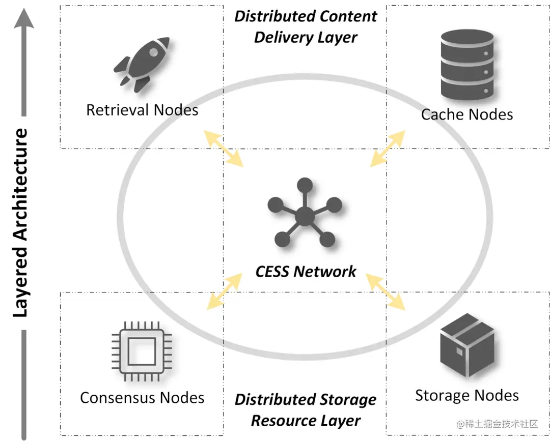 四种节点依据其职能的不同,在 CESS 的网络层级中各司其职、互相配合。其中,共识节点和存储节点组成了存储资源层,以维护数据对象的完整性。缓存节点和检索节点组成了内容分发层,以确保数据对象的可用性。 而关于 CESS 采用自下而上的多层网络架构设计,我们已在 CESS 机制详解系列文章中介绍,如有兴趣了解详情请滑动至文末点击相关链接。下面将继续为大家介绍 CESS 网络中的四种主要节点。