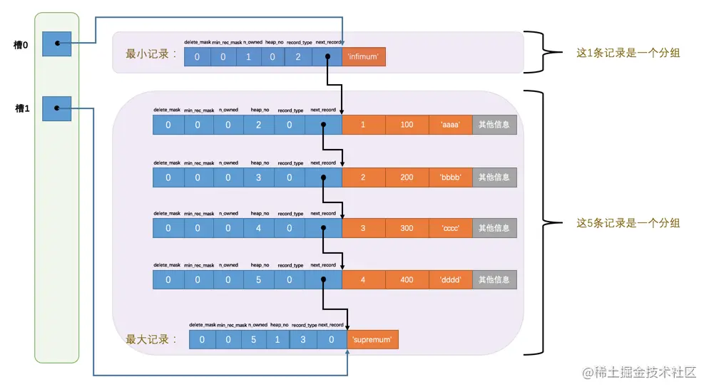 - 初始情况下一个数据页里只有最小记录和最大记录两条记录,它们分属于两个分组。