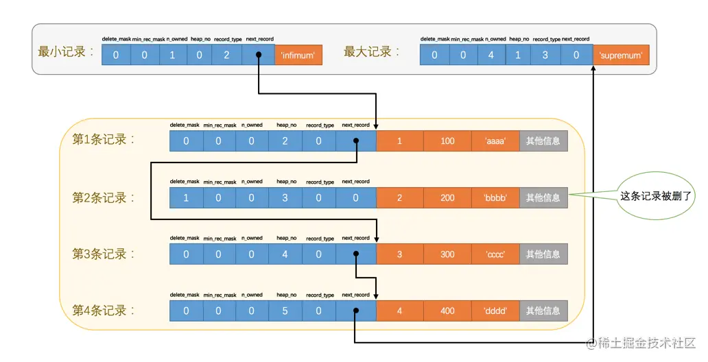 - 记录头信息:标记删除位、当前记录在记录堆的位置信息、下一条记录的相对位置等