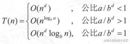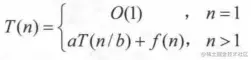 一个大的复杂问题分为a个形式相同的子问题,这些子问题的规模为n/b,且分解或者合并的复杂度为f(n),那么总的时间复杂度可以表示为: