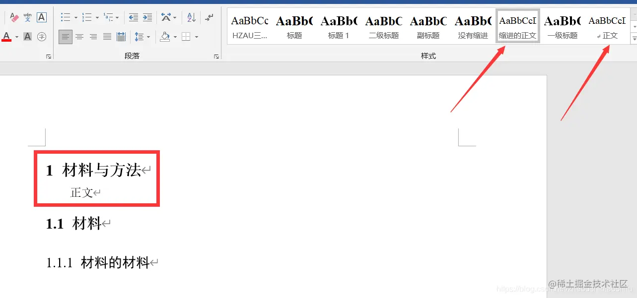 然后,我们在今后需要用到正文的时候,直接选择刚刚新建的“缩进的正文”,而不要选择“正文”,如下图。可以看到,此时,正文是缩进的,而标题没有缩进。