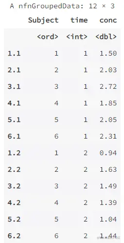 head(Indometh,12) # 这里增加一行,预览数据前 12 行,方便对比