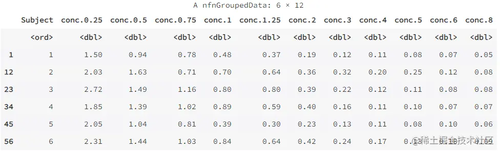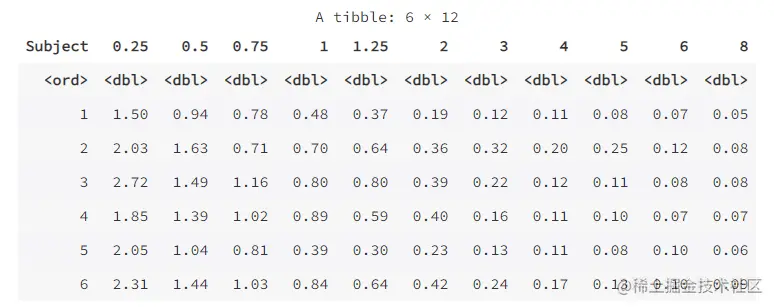 下面以 datasets 包里的数据集 Indometh 为例进行说明。该数据集是关于药物吲哚美辛(indometacin)的药物代谢动力学数据,一共有 6 名试验对象,每名试验对象在连续的 8 小时内定时测定了血液中的药物浓度,共有 11 次的测定值。该资料是长格式,下面将其转换为宽格式。