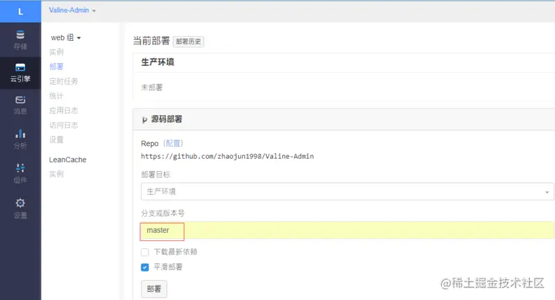 点击 云引擎 -> 部署,分支或版本号输入master,部署