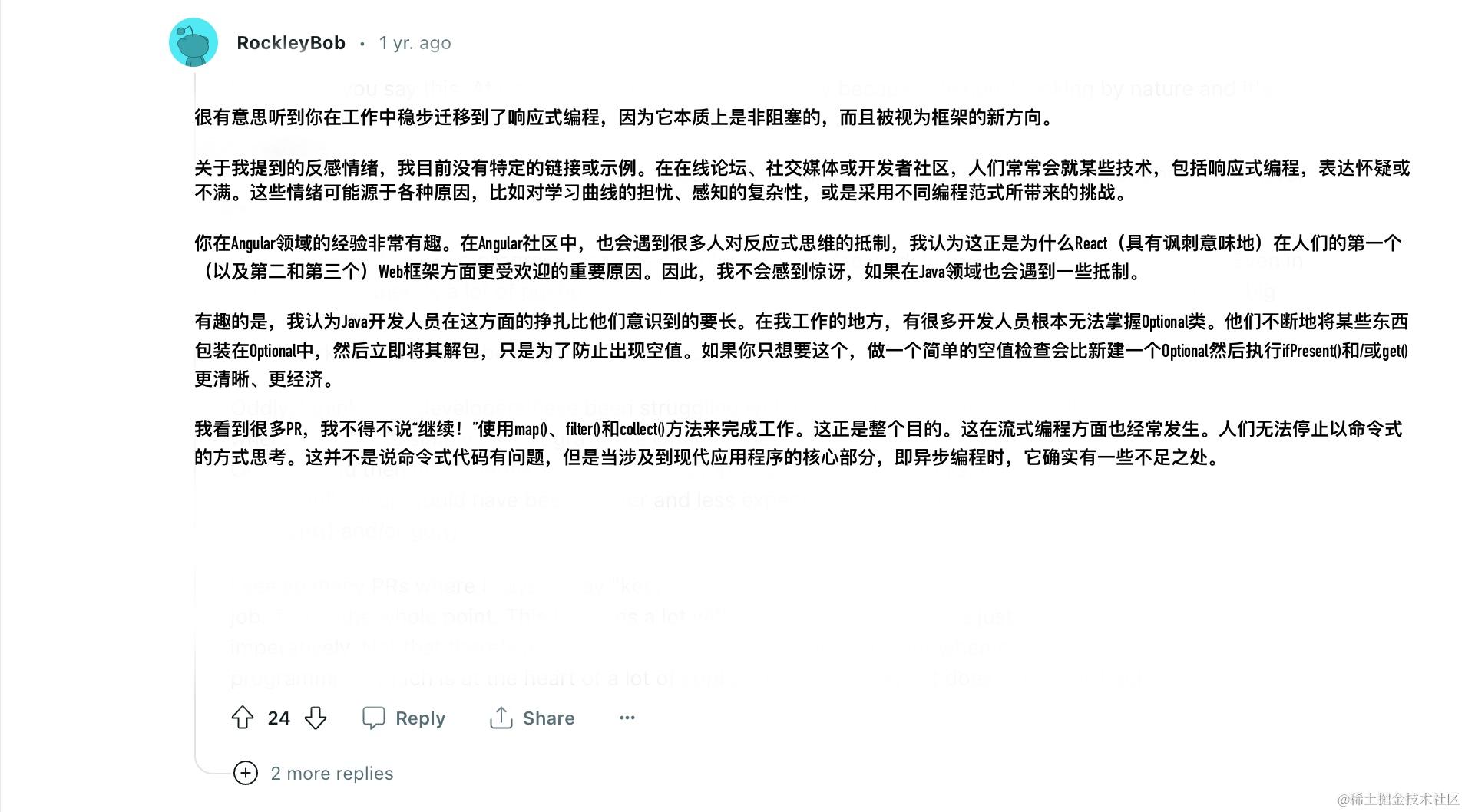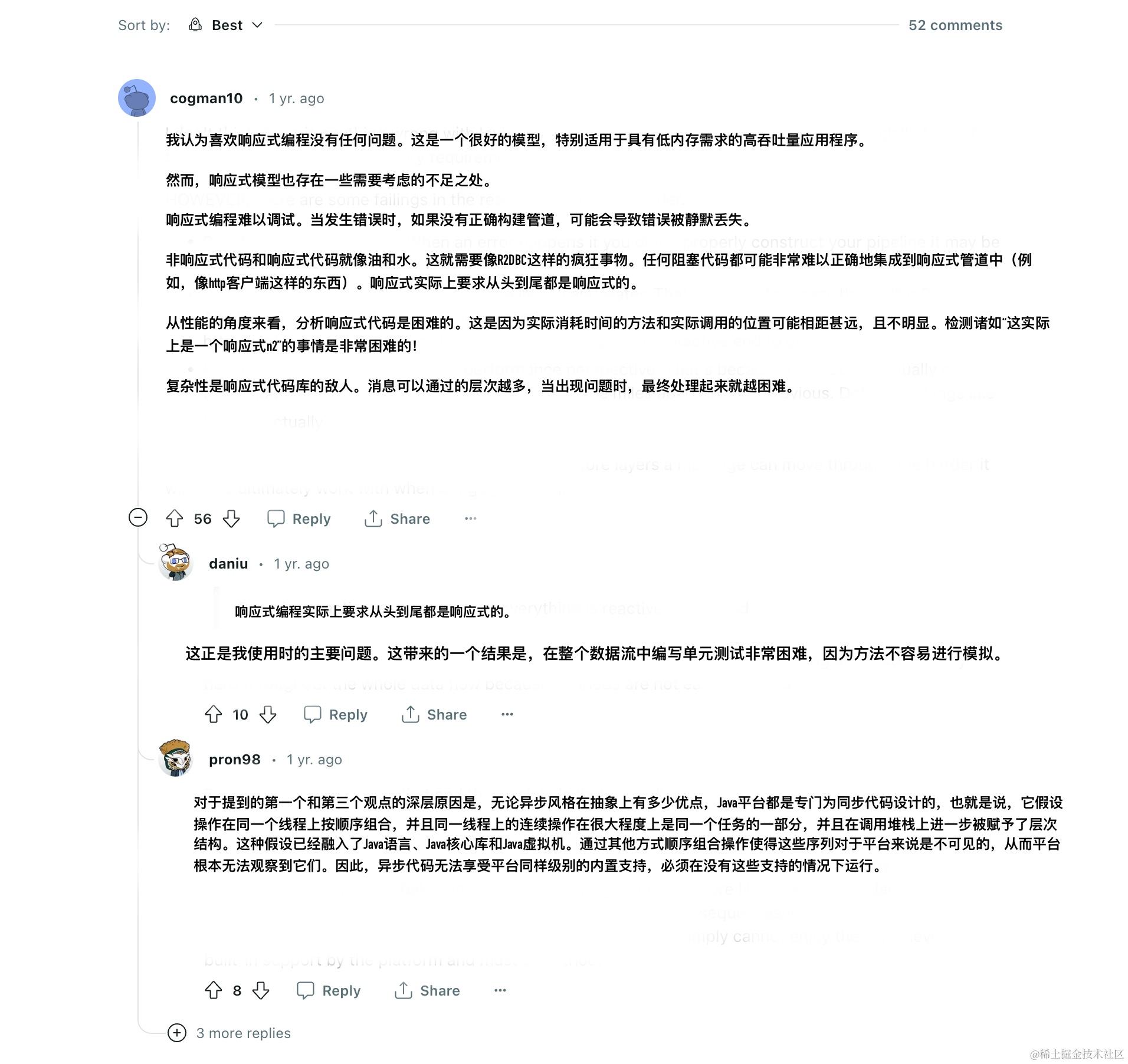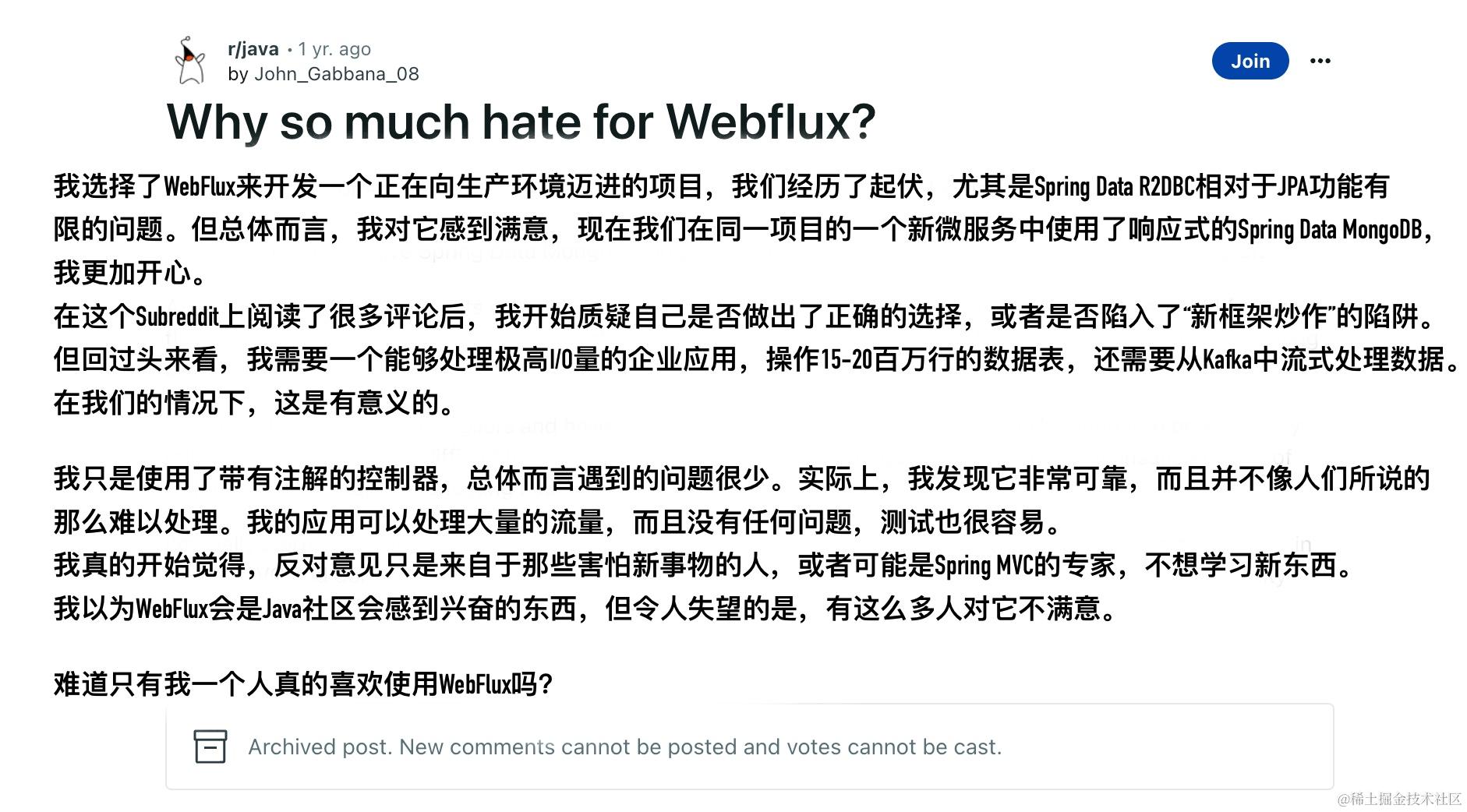在上面的比较结果中,似乎WebFlux落于下风,没有带来更好的性能,以及在TechEmpower的测试上webflux排名已经到了375,但是我在Reddit上又找到了一些不一样观点。
