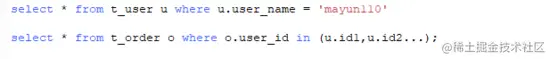 当 t_user 表的数据集小于 t_order 表时,用 exist 优化 in,使用 exists,两表执行顺序是先查 t_user 表,再查 t_order 表