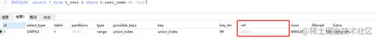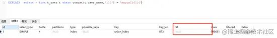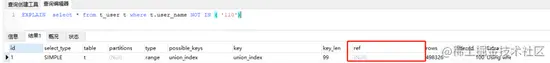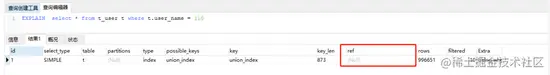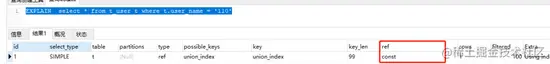 ref:这个连接类型只有在查询使用了不是惟一或主键的键或者是这些类型的部分(比如,利用最左边前缀)时发生。 没有值说明没有利用最左前缀原则
