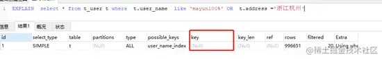 可以看到这条语句没有使用到索引,是因为当or左右查询字段只有一个是索引,该索引失效,只有当or左右查询字段均为索引时,才会生效。