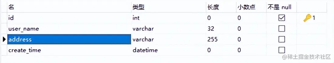 咱们建一张用户表,表中的字段有用户ID、用户名、地址、记录创建时间,如图所示