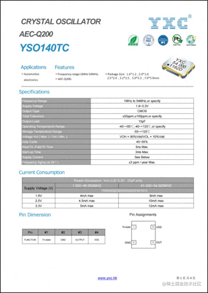 针对车载激光雷达电路设计需求,推荐使用YXC车规级振荡器YSO140TC系列,具体参数如下: