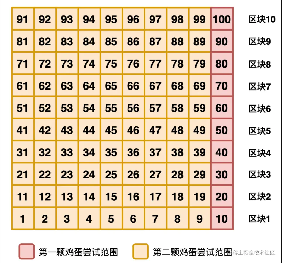 虽然第二颗鸡蛋在区块内部的逐层尝试次数是一样的,但98层对应的总尝试次数就多太多了。