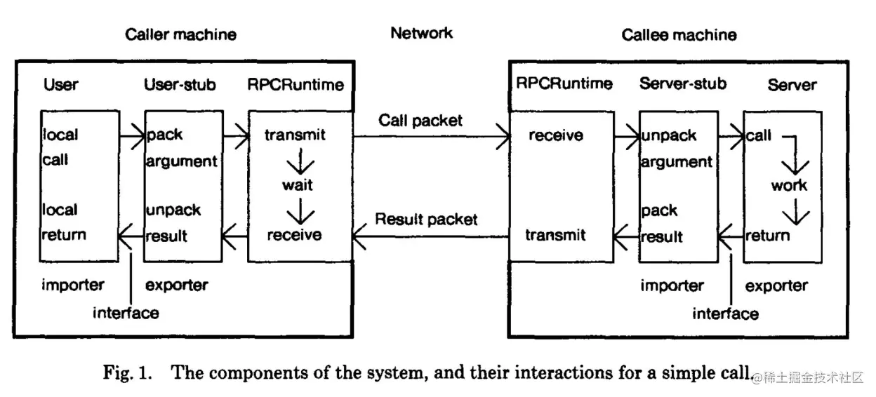 理论模型:分为调用端和被调用端。首先User发起一个本地调用,调用User-stub将参数进行打包,然后RPCRuntime将打包后的通过网络传递给被调用端的RPCRuntime,RPCRuntime接收完后交给Server-stub来解压数据,然后调用真正的业务逻辑Server并处理,将处理完的返回的结果进行打包通过网络传输传递到调用端RPCRuntime,然后将结果解压出来并返回。