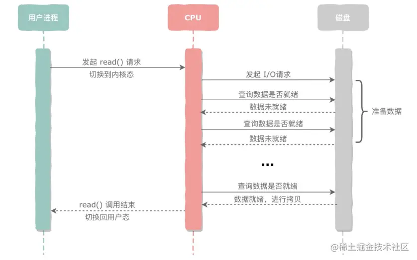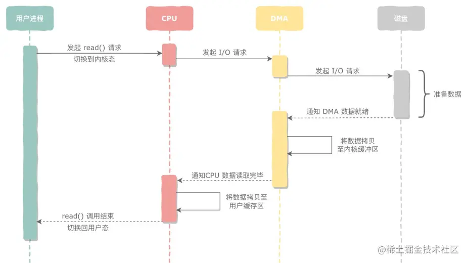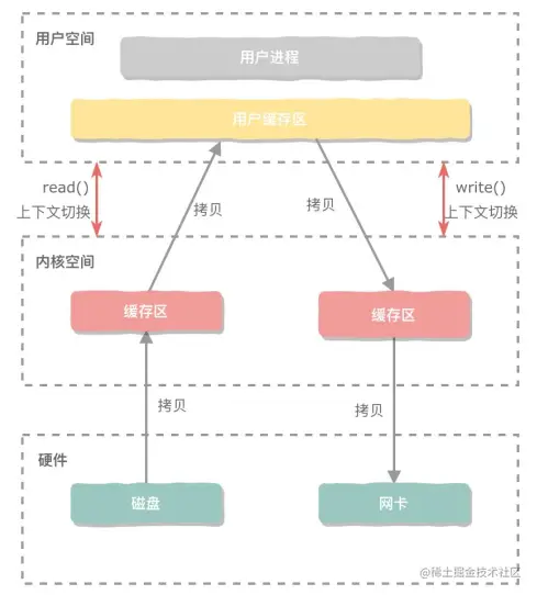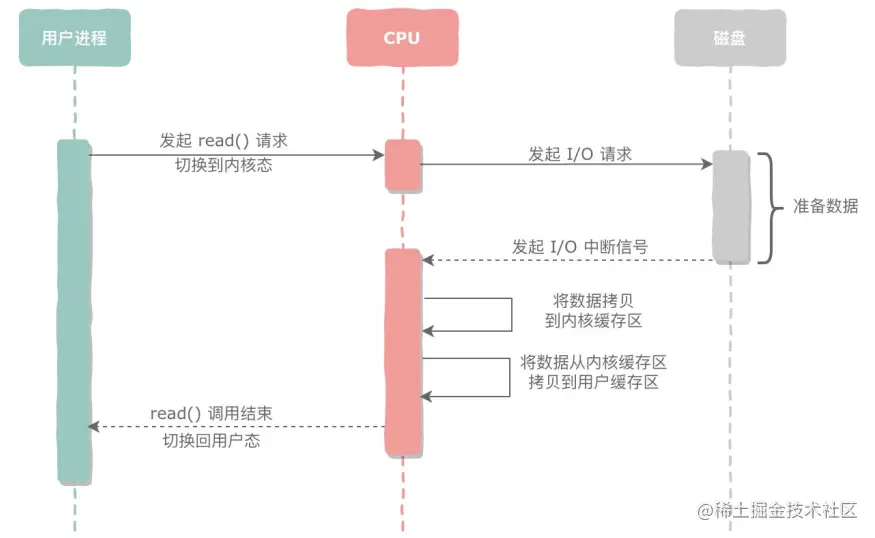 CPU上下文切换: 当调用read()方法时,就发生了一次上下文切换。CPU上下文切换的过程中,首先会保存CPU寄存器里原来用户态的指令位,为了执行内核态代码,CPU寄存器需要更新为内核态指令的新位置,然后跳转到内核态运行内核任务,最后当系统调用结束后CPU寄存器需要恢复原来保存的用户态,然后在切换为用户空间继续之前运行的进程。