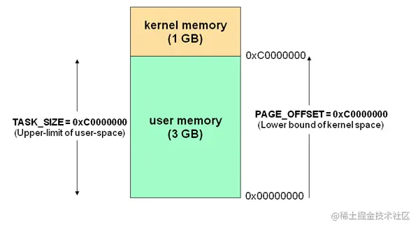 32 位操作系统的寻址空间(虚拟地址空间,或叫线性地址空间)为 4G(2的32次方)。即一个进程的最大地址空间为4G。在Linux的虚拟地址空间中,用户空间和内核空间的大小比为3:1。每个进程的 4G 地址空间中,最高 1G 都是一样的,即内核空间。只有剩余的 3G 才归进程自己使用。