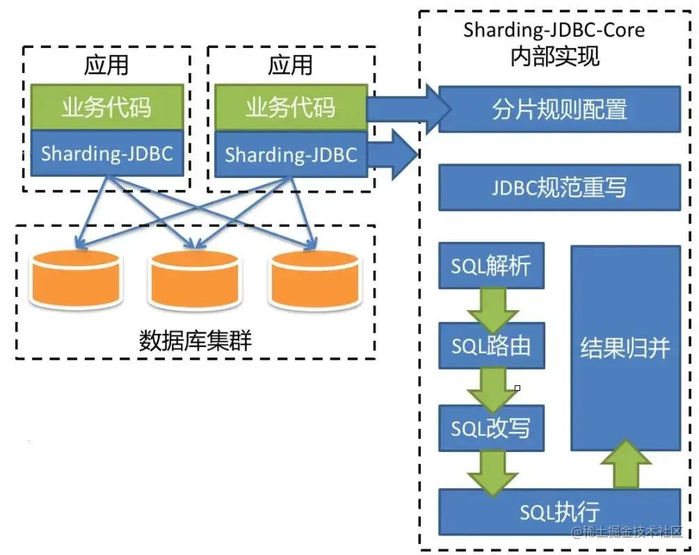 特点:jar包方式提供,属于client端分片,支持xa事务