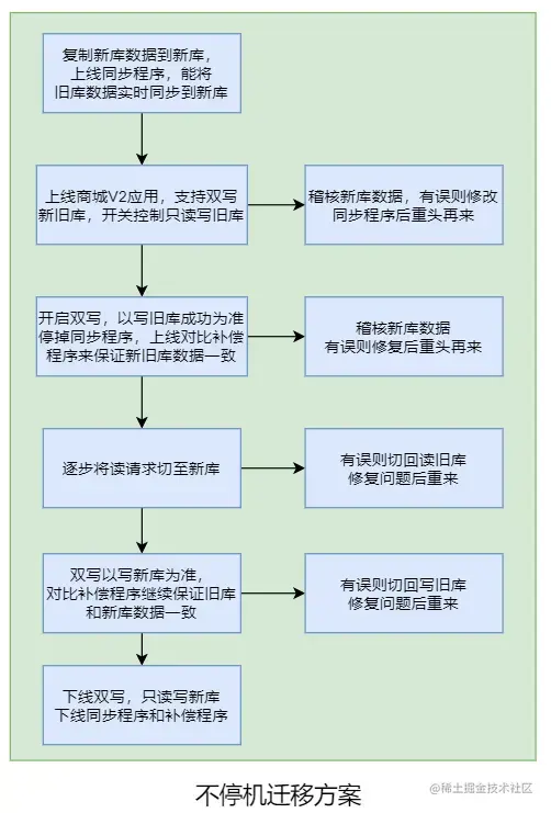 - 读写都切换到新库上,对比补偿程序确保旧库数据和新库一致。