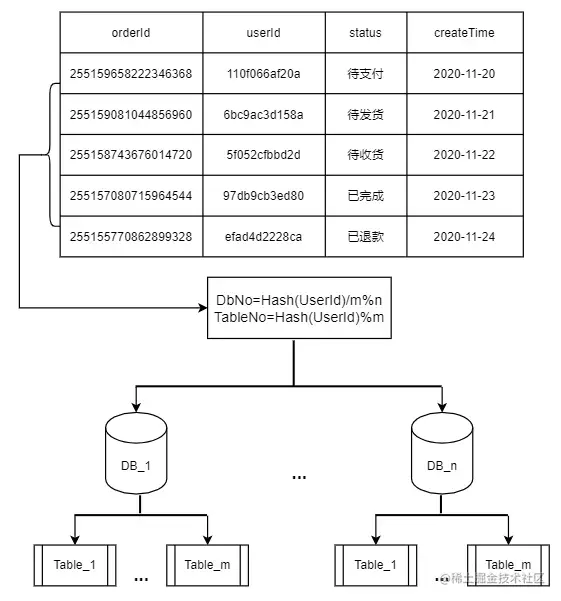 - 库序号:Hash(userId) / m % n